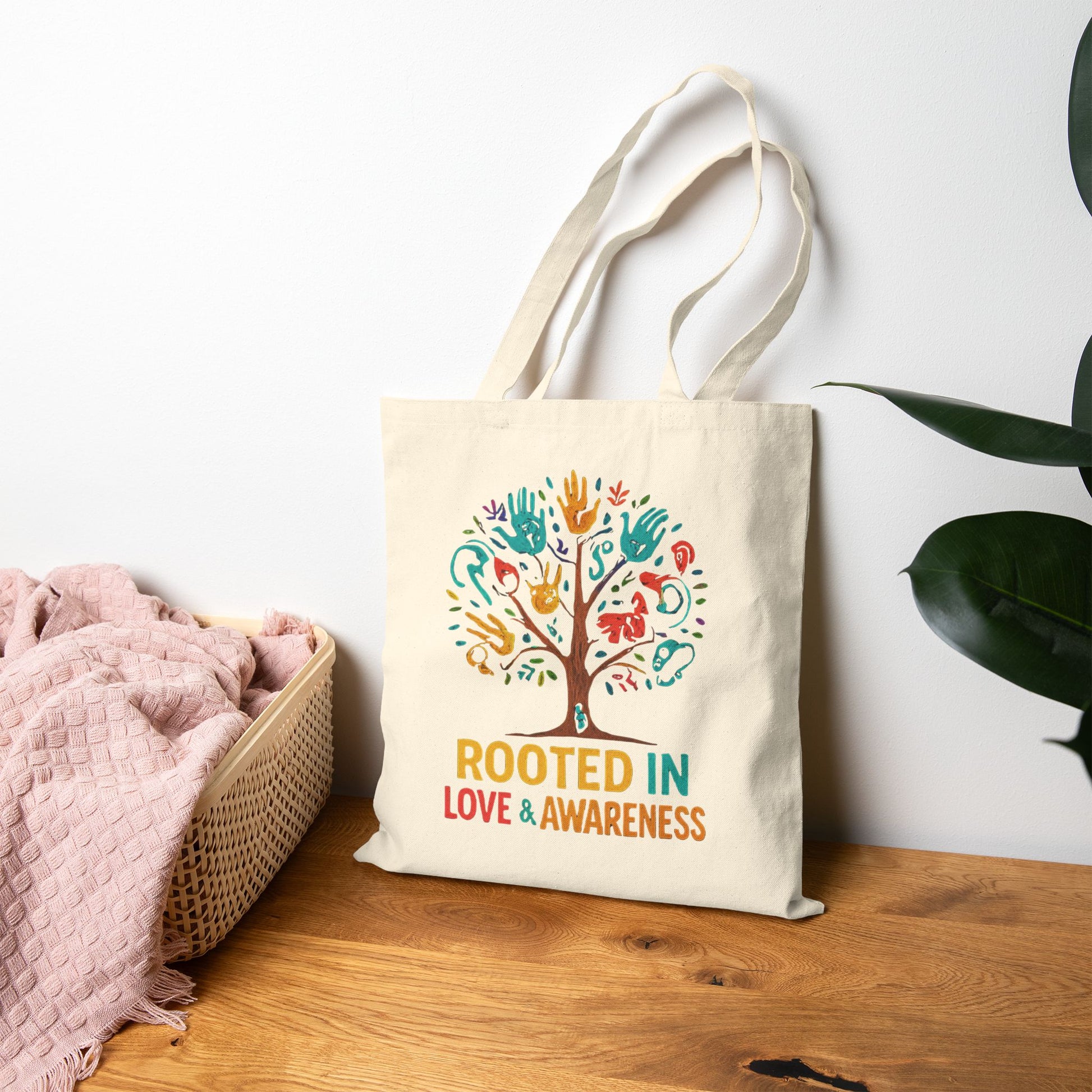 Rooted in Love & Awareness Tote Bag, Eco-Friendly Shopping Bag, Gift for Nature Lovers, Reusable Canvas Bag, Boho Tote, Earth Day Gift